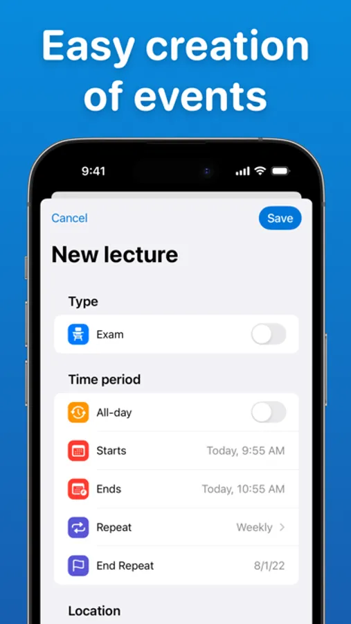 - Unlike most other timetable apps, you can edit your events flexibly. For example, you can easily delete individual events of a series if your event was canceled on a certain day.