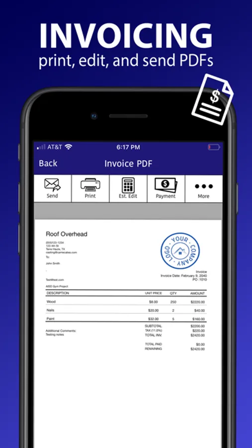 With a monthly subscription, you can create a job and we will keep the records for the estimate, invoice, and work order. We create, save, and present PDF estimates, work orders, and invoices for your viewing, emailing, and printing.
