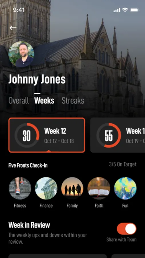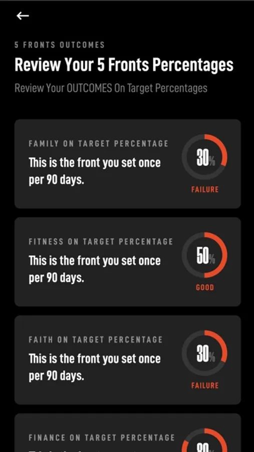 - Quarterly Outcomes: set and track quarterly goals across Fitness, Faith, Family, Finance, & Fun