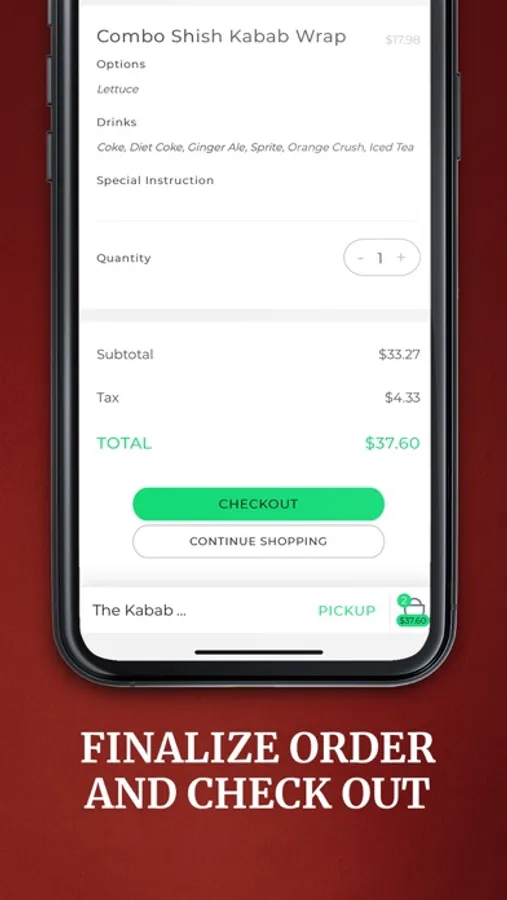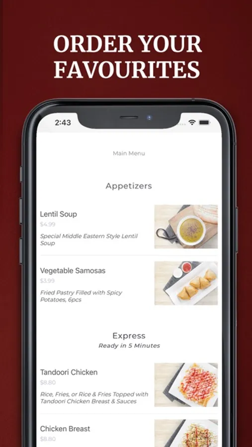 Download The Kabab Shoppe’s Food Ordering App and plan your next meal by browsing through The Kabab Shoppe’s menu. Quickly order Appetizers, Express Items, Wraps & Burgers, Kababs,Speciality Dishes, Platters, Marinated Meat, Desserts, Catering packages using our app.