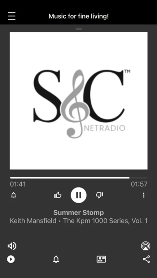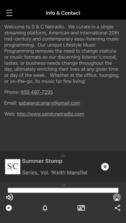S & C Netradio streaming platform American and International 20th mid-century and contemporary easy-listening music programming. Our unique Lifestyle Music Programming removes the need to change stations or music formats as our discerning listener’s mood, tastes, or business needs change throughout the day, ultimately enriching their lives at any given time or day of the week. Whether at the office, lounging, or on the go, its music for fine living.