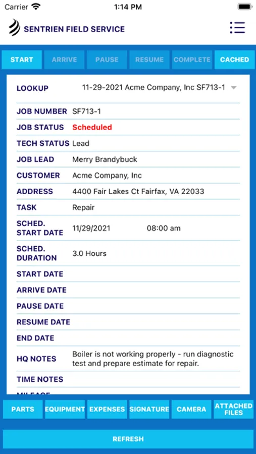 The Sentrien Field Service application connects employees in the field with jobs created in NetSuite. Employees can see information sent by headquarters, add notes and signature data, enter or modify parts used, create expenses, view attached files, and take photos, and this data is transmitted back to NetSuite. An internet or cellular connection is required to send and receive data from NetSuite, but data can still be entered on jobs previously downloaded and will be cached to send to NetSuite when the connection is restored.