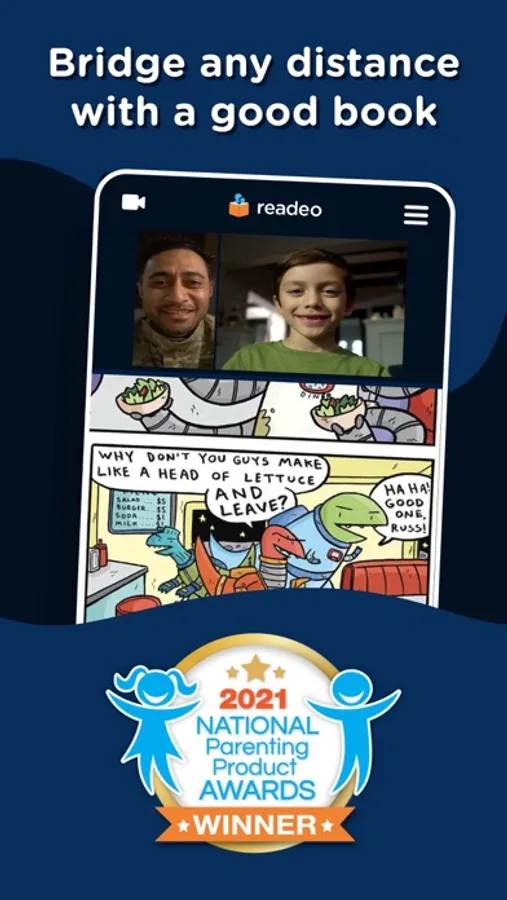 Readeo is great for grandparents, traveling parents, military families, divorced families, and every family in between. Our virtual reading app helps shrink the miles between you and your loved ones as it facilitates meaningful connections and deeper relationships. Children can read from our library of books with another user virtually, or on their own.