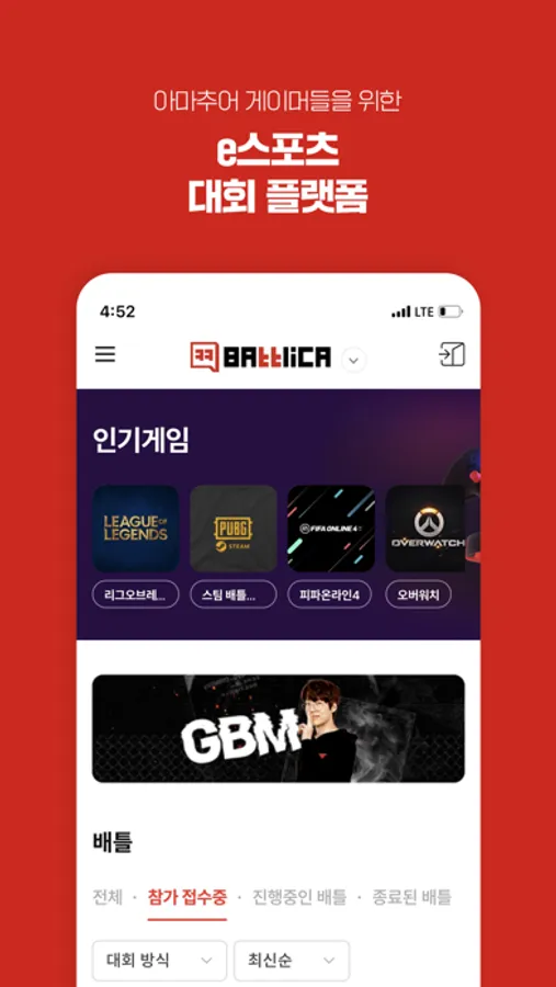 배틀리카는 e스포츠의 근간인 PC방 리그에서 시작하여 성장한 토너먼트 플랫폼입니다.