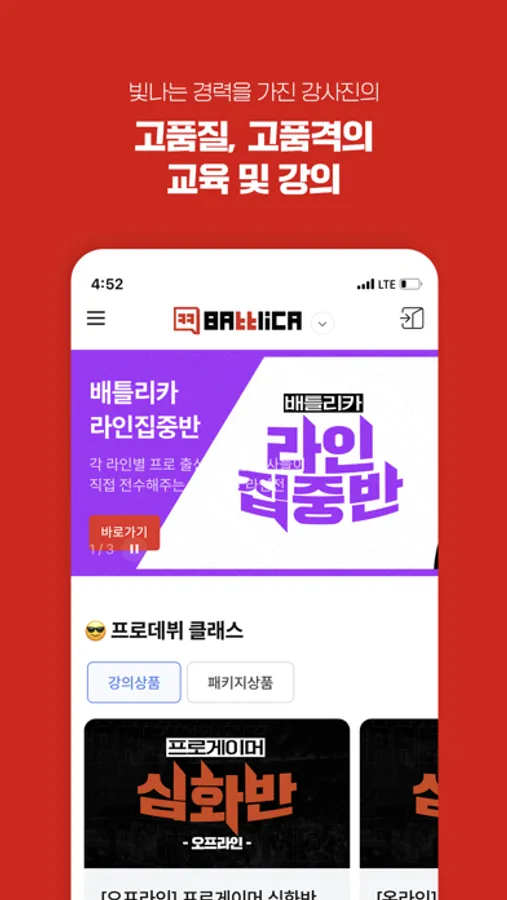 리그 오브 레전드, 오버워치, 배틀그라운드 등 다양한 종목의 강의를 수강할 수 있습니다.