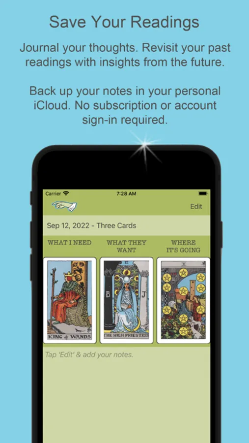 You control the action and SHUFFLE WITH INTENTION! And with MORE THAN 30 READING CHOICES, including the popular Celtic Cross, Tarot Simple provides an intuitive and personalized experience to help you connect with your intuition and find insights on matters of love, career, money, success, spirit, relationships, and daily life. You can explore a variety of tarot spreads, or customize your own readings with the option to LOG READINGS DONE WITH YOUR PHYSICAL CARDS.