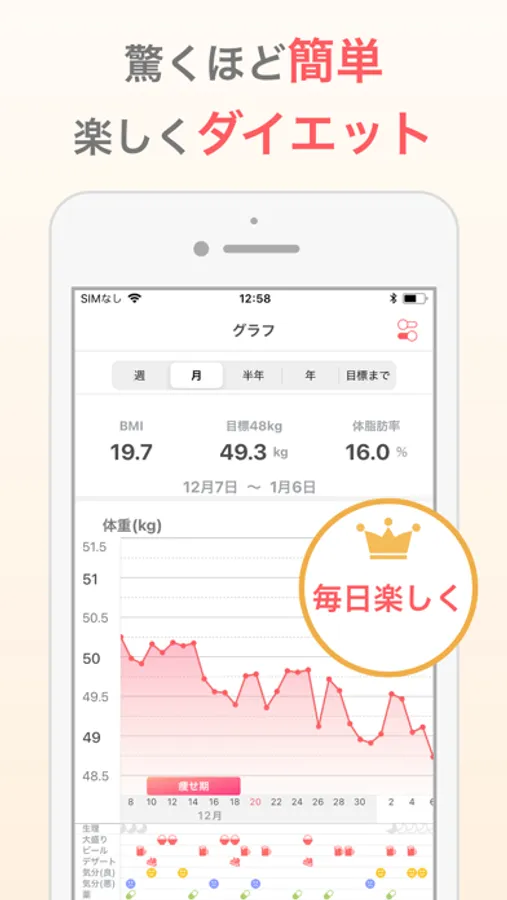 ダイエットに関するスタンプやメモの記録など充実してて、生理も管理できるから女性の手帳としてもベ便利。次の生理や痩せ期もひと目でチェックできます。