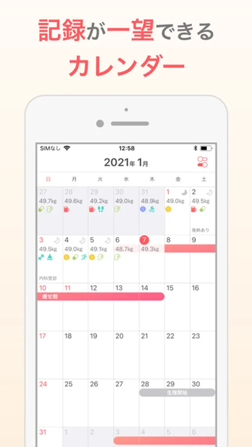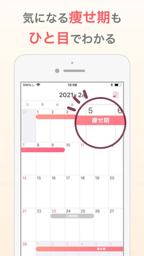 生理を記録すればカレンダー上で痩せ期や次回生理予定をひと目でわかるように表示します。