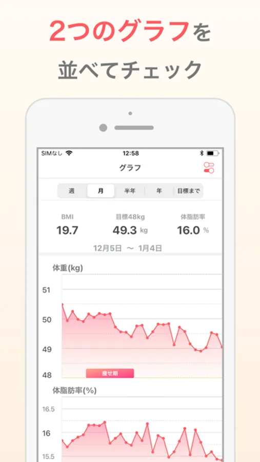 記録した体重、体脂肪率、ウエストの変化をグラフで全てチェックできます。