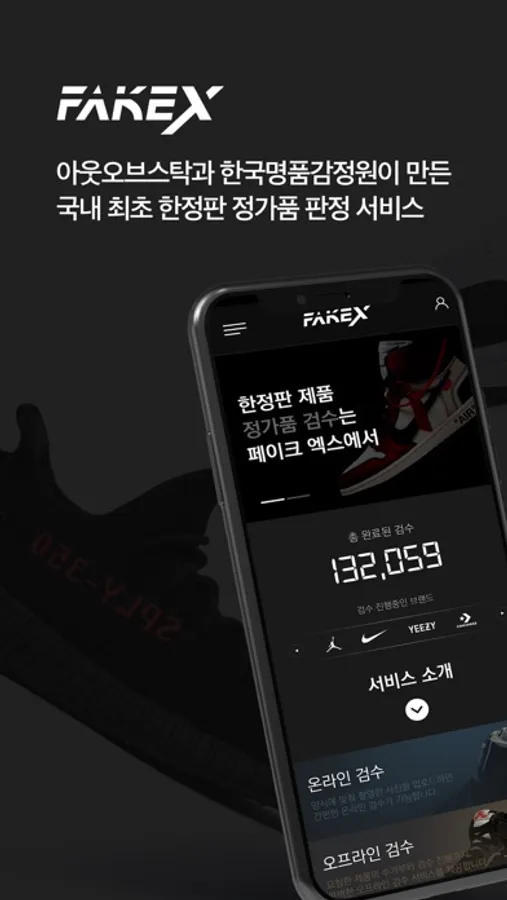한정판 스니커즈부터 의류, 명품, 시계 등의 정가품 판정을 온라인 및 오프라인으로 이용할 수 있는 국내 최초 한정판 정가품 판정 서비스 FAKEX(페이크엑스)입니다.