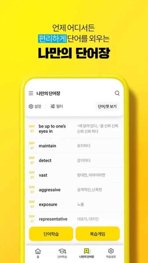 못 외운 단어를 한 곳에 모아 쉽게 암기하고, 외웠던 단어를 다시 복습할 수 있습니다.