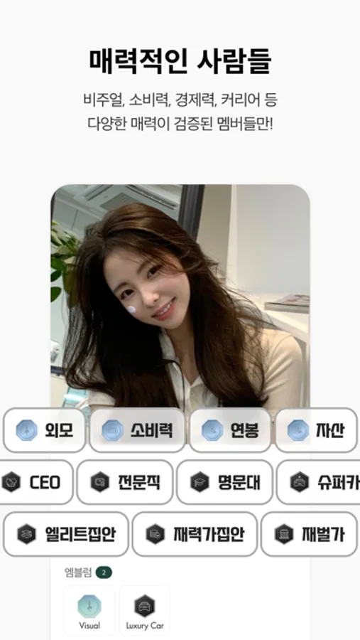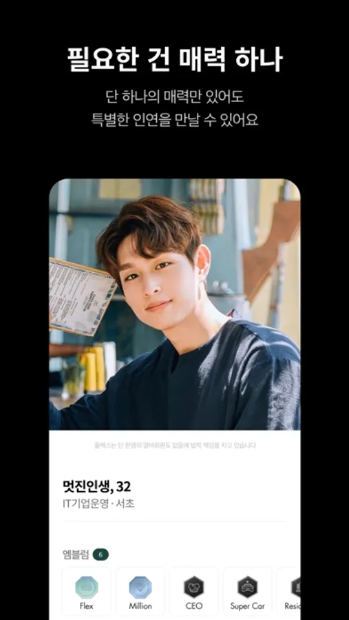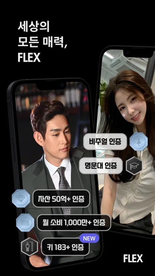 플렉스는 외모, 경제력, 자산 등 다양한 매력 중 1가지 이상이 검증된 사람만 멤버가 될 수 있어요. (키, 외모, 소비력, 경제력, 명문대, 사업가, 전문직, 셀러브리티, 고급차, 슈퍼카, 엘리트 집안, 재력가 집안 등)