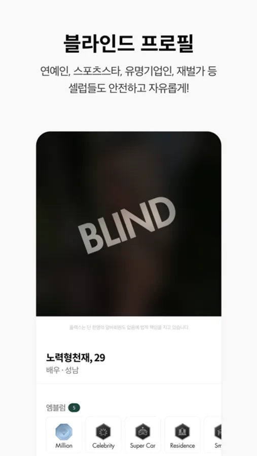 연예인, 아나운서, 스포츠 스타, 예술가, 유명 기업인, SNS 인플루언서 등 높은 인지도를 가지고 있는 멤버들은 프로필 사진을 등록하지 않고 이용할 수 있어요. 소개팅 첫 만남까지 누구인지 알 수 없기에, 상대에 대한 편견 없이 서로를 알아갈 수 있어요.