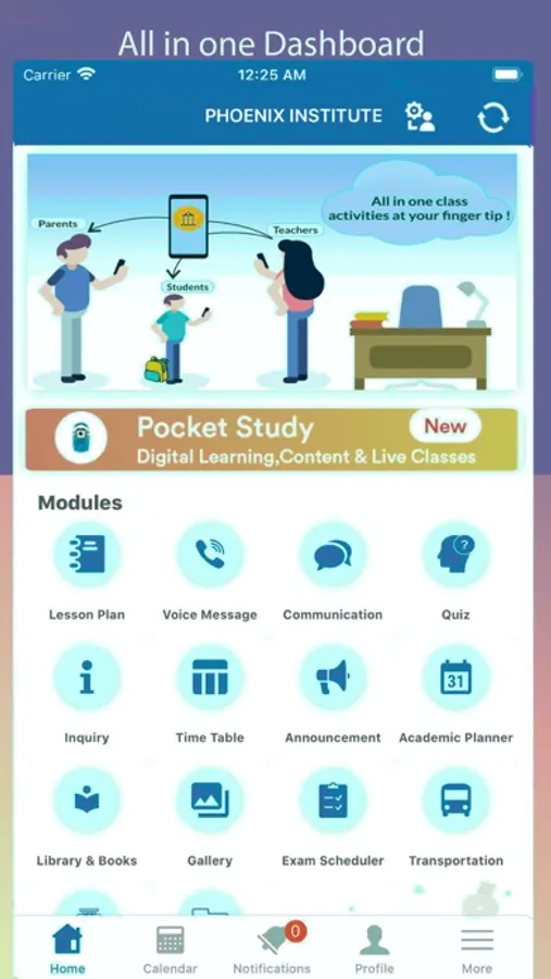 PHOENIX Institutes App is a platform which helps students, Teachers and Parents get connected. A common tool to interact, share & learn together via dynamic tools of this Web/App. Here, everybody is free to learn & grow via digitally connected campus of an institute which help an individual in daily activities like sharing digital materials, discuss on board, creating and participating in live tests, notice board, Calendar module and many more.