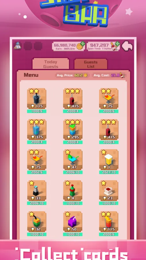 Serve your customers with various and special drinks and wines that on your menu. By spinning roulette you have a chance to get more menu cards. It does can help you have more recipes and drinks for customers with different tastes on the Star Bar. You can develop recipes to change the properties of drinks and obtain the best wine list with high income and low consumption.