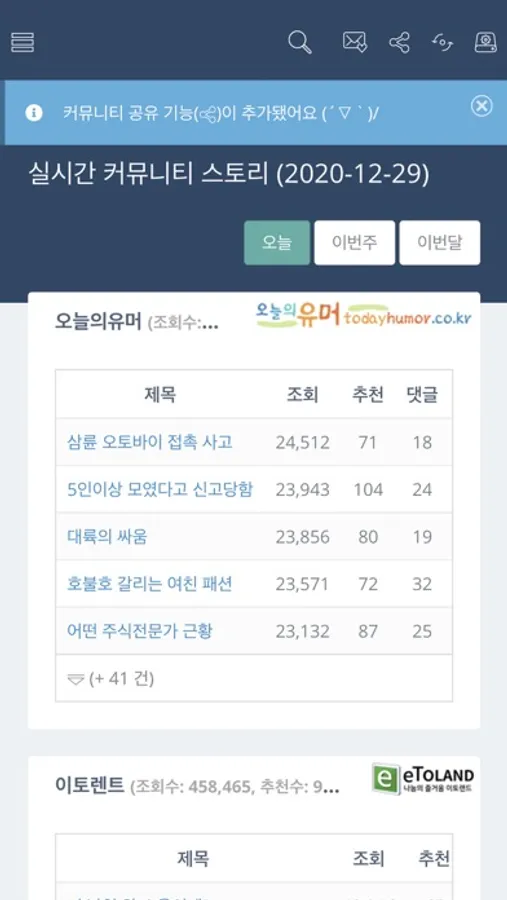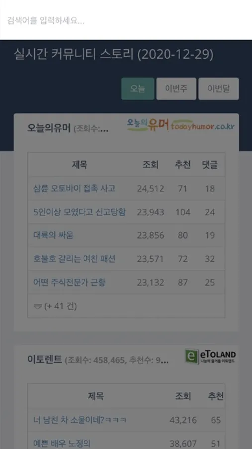 - 오늘, 이번주, 이번달의 실시간 온라인 커뮤니티 베스트 글 제공