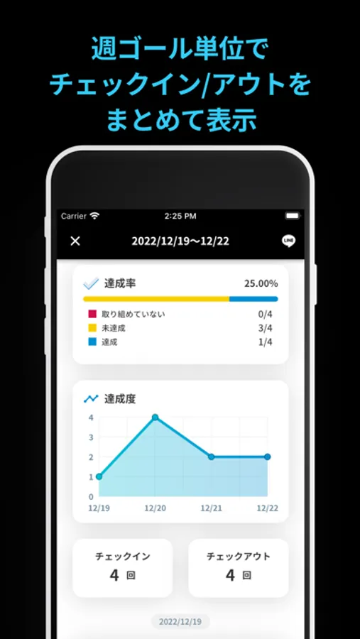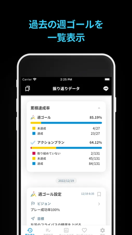 チェックイン・チェックアウト・週ゴール設定・週ゴール振り返りの記録をすべて見返すことができます。