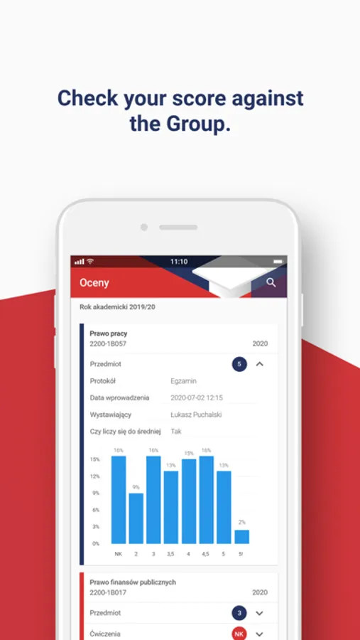 Tests - the student will see points from tests and final assignments, and the employee will be able to enter points, grades, comments and change the visibility of the test. The system sends notifications about new results on a regular basis.