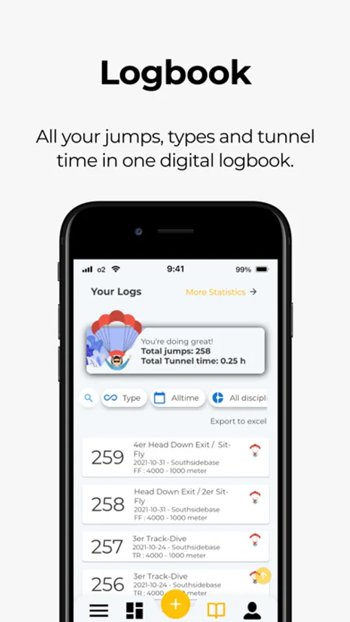 The Logbook functionality lets you log all your jumps at different dropzones in one place. Get an easy overview about your skydive history with loads of detailed statistics and insights. When you first use the app, try the mass logging feature to add up to 1000 jumps at once or set your data initially in your profile. All logs are kept safely in the cloud enabling you to switch devices without losing any of your entries.