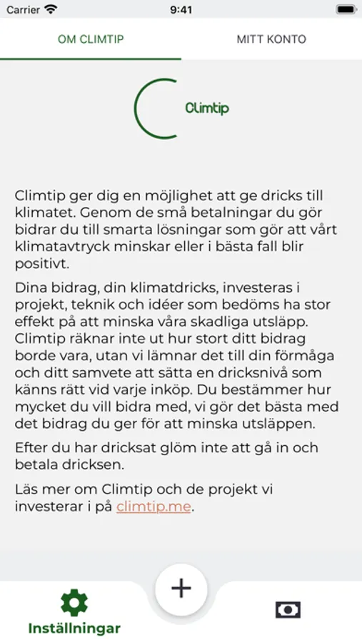 Climtip gör det möjligt att ge dricks till klimatet. Genom de microbetalningar du gör bidrar du till att ny smarta lösningar som är bra för klimatet. Dina donationer tas hand om i en stiftelse vars enda uppgift är att investera pengarna i projekt och idéer som är smarta för klimatet. Eventuell vinst i stiftelsen återinvesterar i klimatsmarta lösningar.