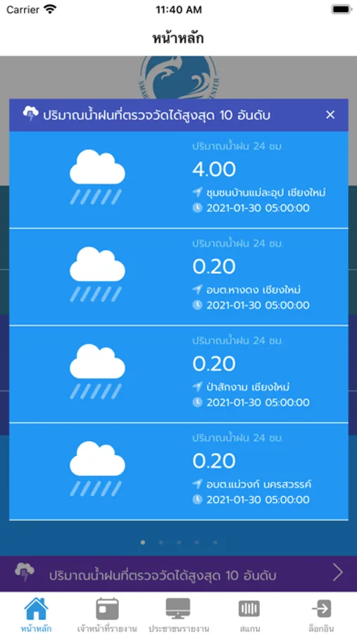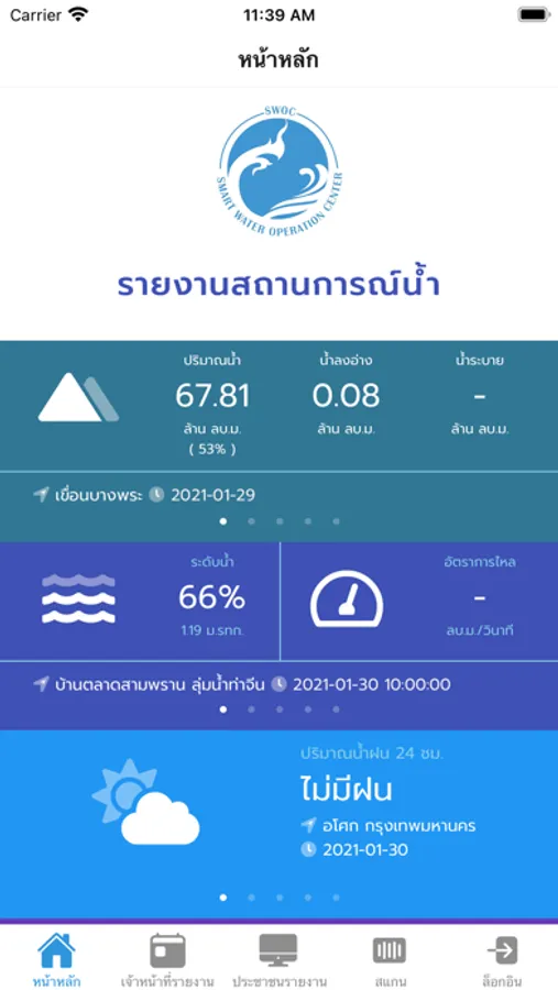 - การรายงานสถานการณ์น้ำจากสถานีตรวจวัดน้ำฝน อ่างเก็บน้ำ และโทรมาตรขนาดเล็ก จากสถานีที่ใกล้กับผู้ใช้งาน