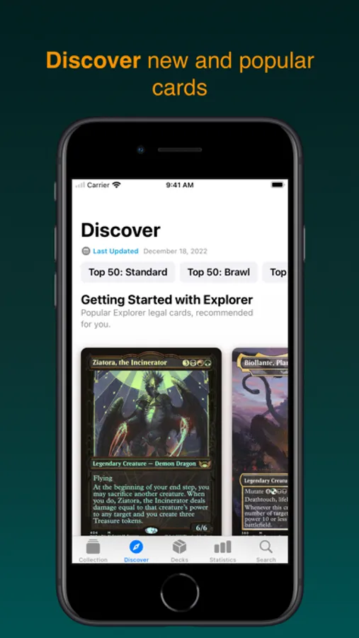- A place to discover new cards. From day to day, see a new color spotlight, featured creatures, and special collections.