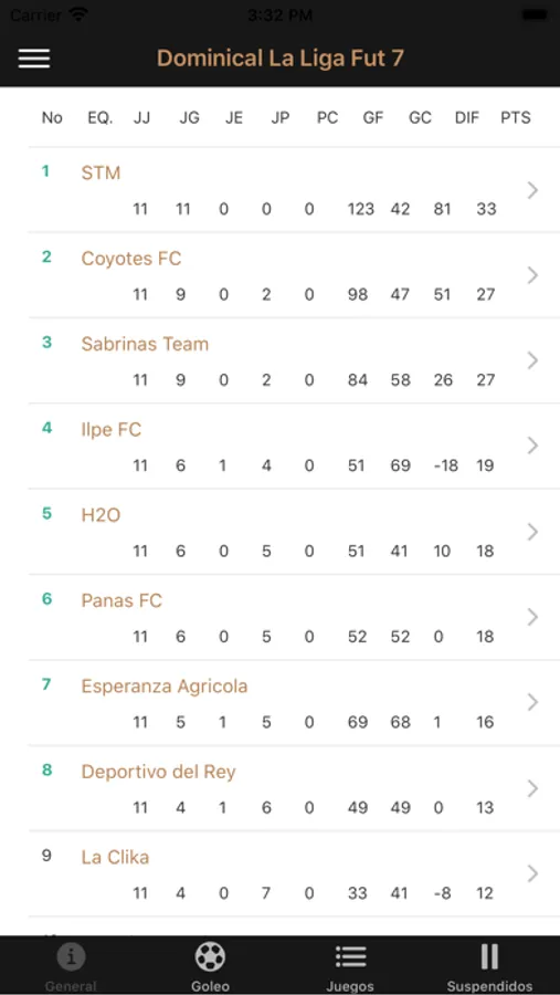 - Estadísticas de cada equipo.