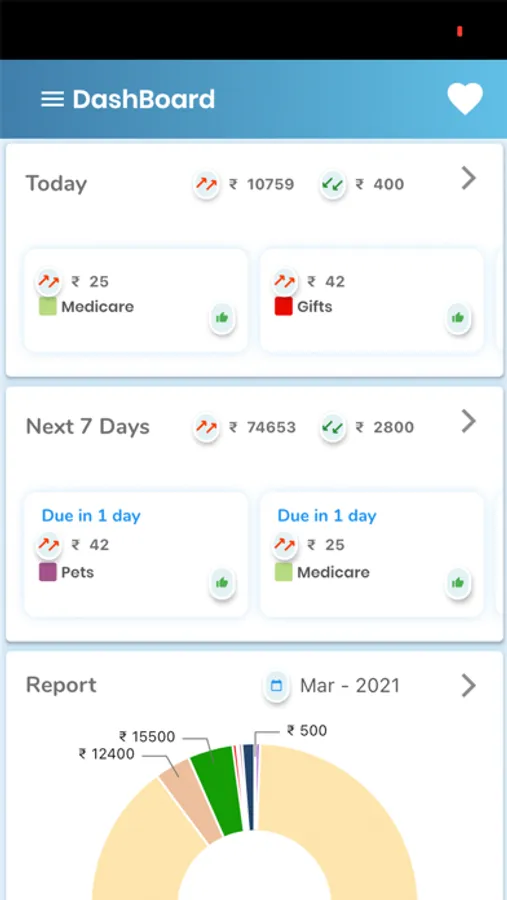 * Charts on reports of your bills and money status.