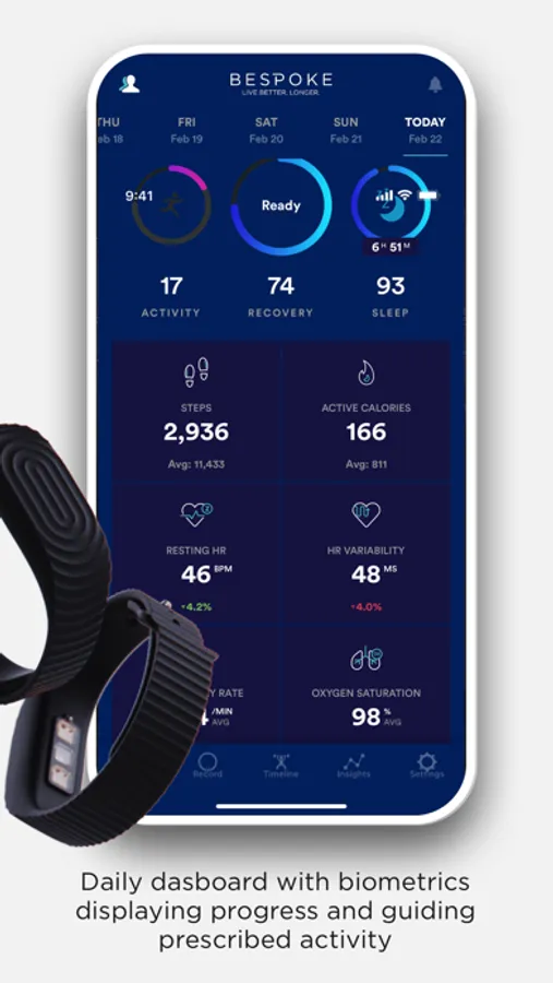 • Daily dashboard with biometrics displaying progress and guiding prescribed activity