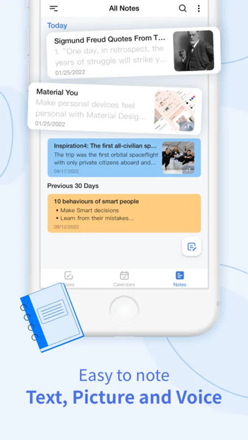 The powerful note-taking feature supports text, image, and voice notes, making it easy to record, organize, and capture your ideas.