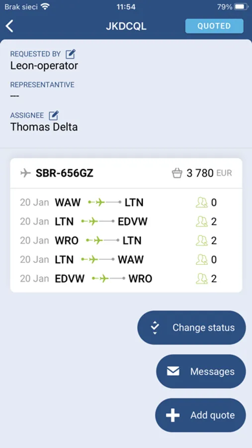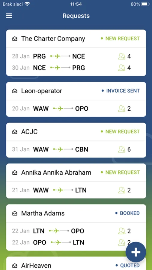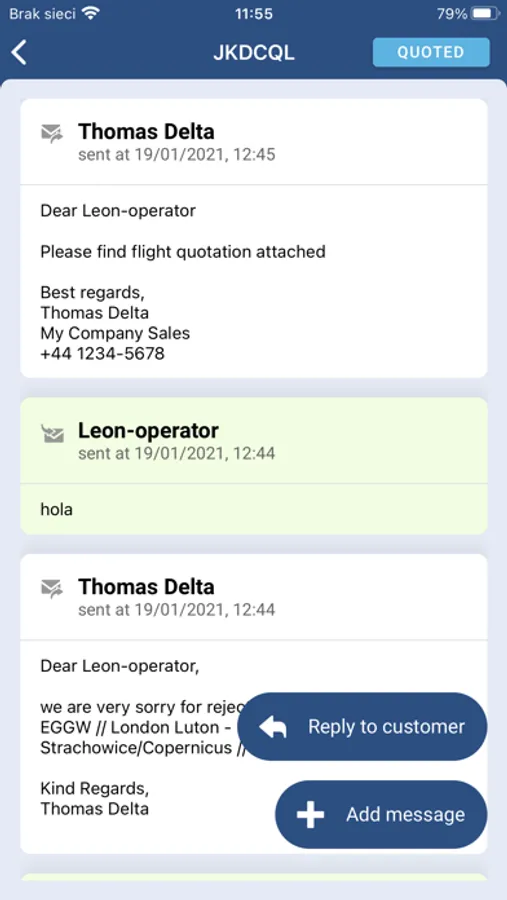 The Leon Sales mobile app is intended for Leon users involved in sales. The application allows you to create, evaluate and send flight quotes. It also allows you to communicate with charter brokers and clients.
