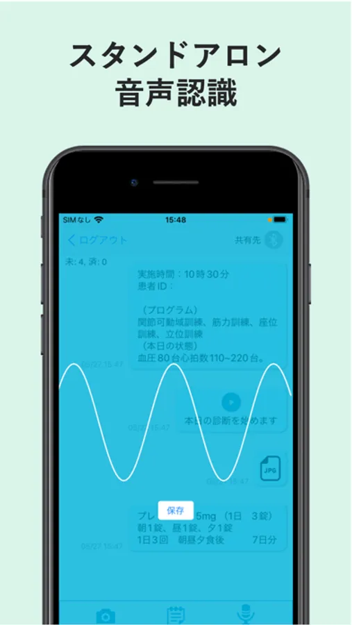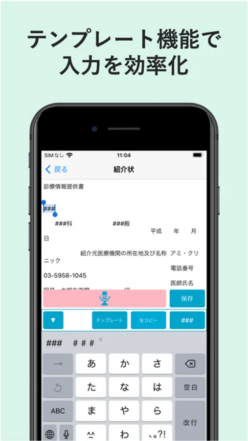 医療用語に特化した、弊社提供AI音声認識エンジン「AmiVoice」を利用し、声での記録作成が可能です。
