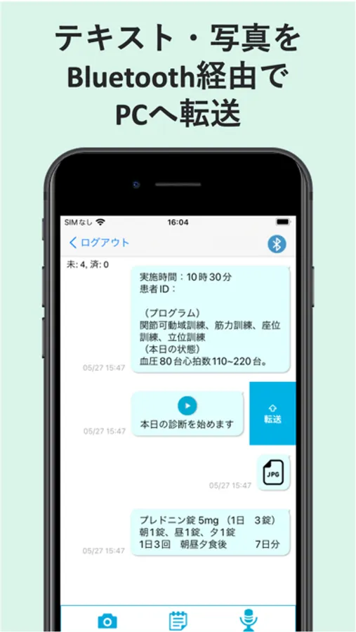 PCへの転送にはBluetoothで通信を行います。PCには専用のUSBドングルを接続し、受信用アプリケーションのインストールが必要です。