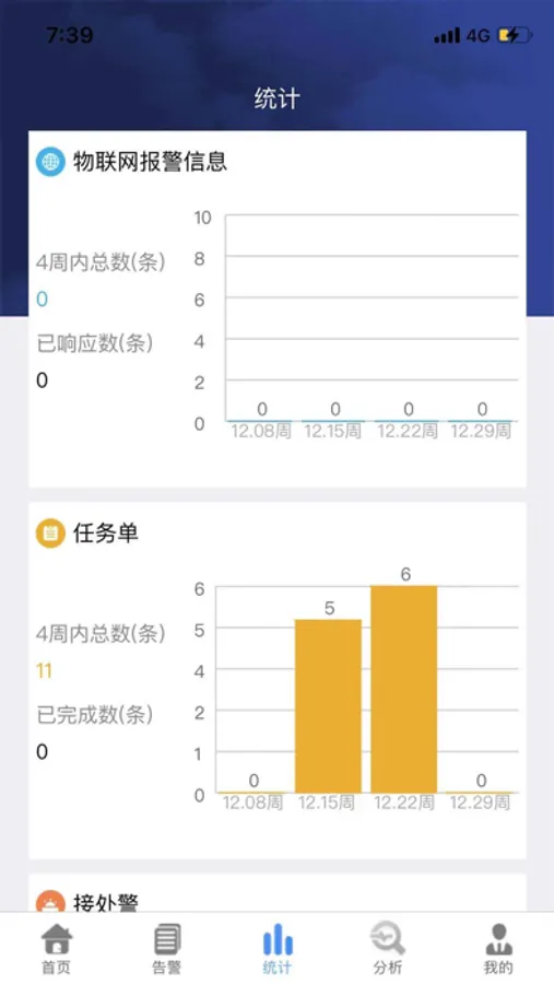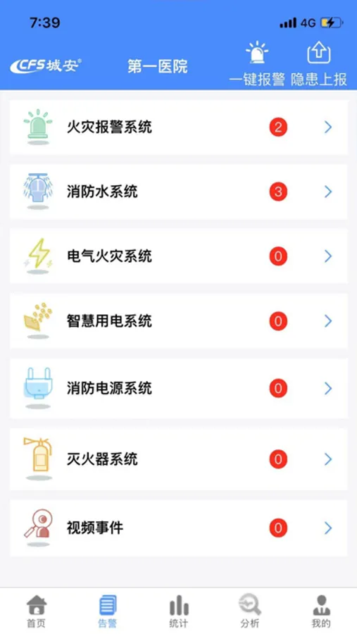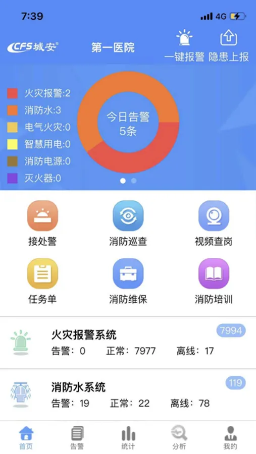 CFS119-企业版APP可用于对监控管理中心接收到的警情信息分类统计,消防安全管理部门,联网建筑总队,支队,联网单位等操作员可以通过自己的账号登录并查看相关的统计数据。