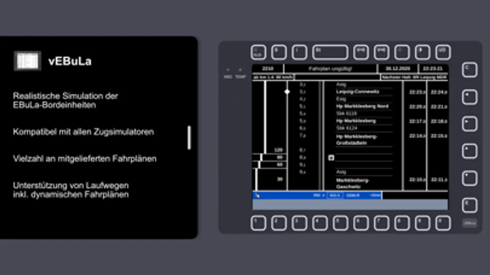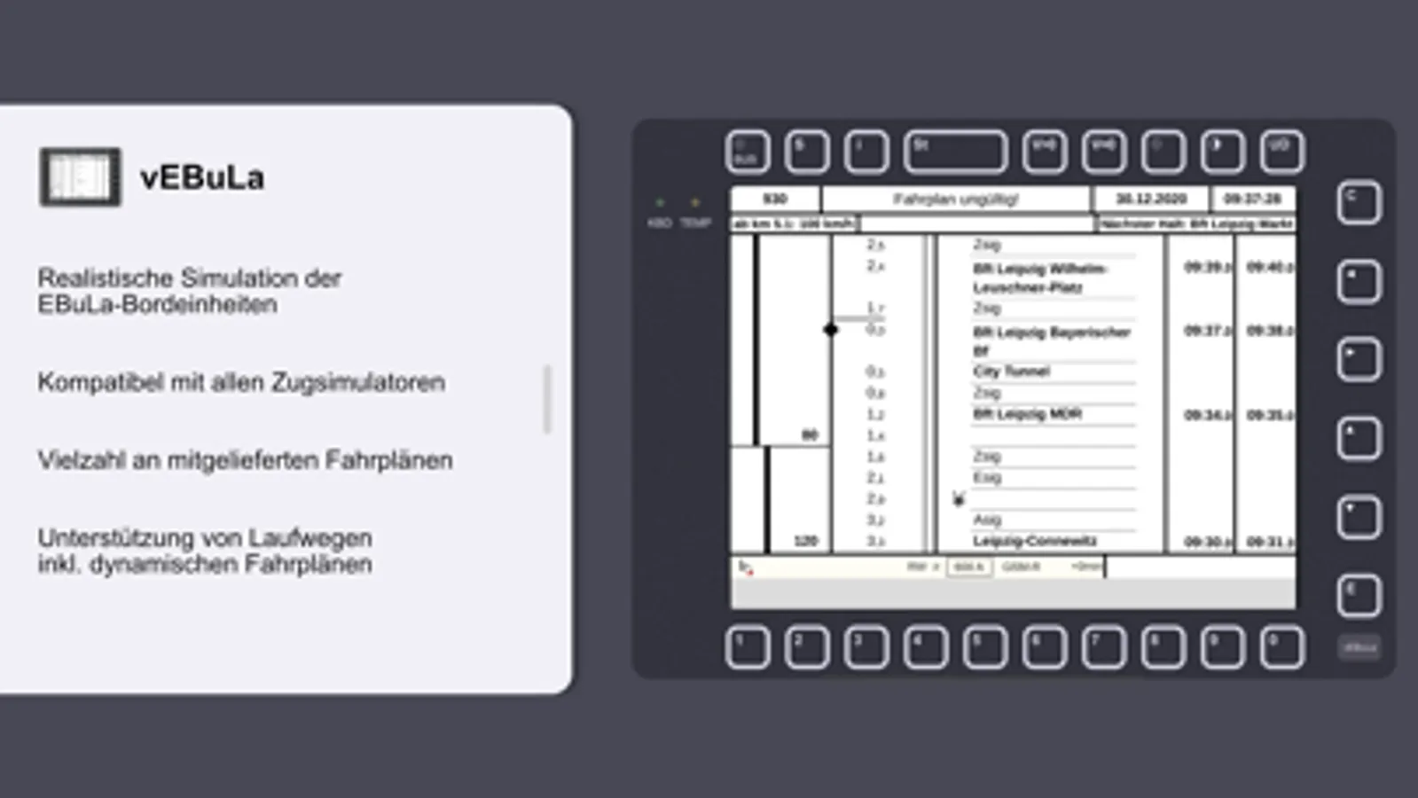 Mit vEBuLa erhältst Du eine detailgetreue Simulation der EBuLa-Bordgeräte moderner Triebfahrzeuge, vollständig kompatibel mit allen gängigen Zugsimulatoren. Wähle aus einer Vielzahl sofort fahrbarer Fahrplänen oder erstelle einen neuen Fahrplan anhand von definierten Laufwegen für ein schnelles Spiel.