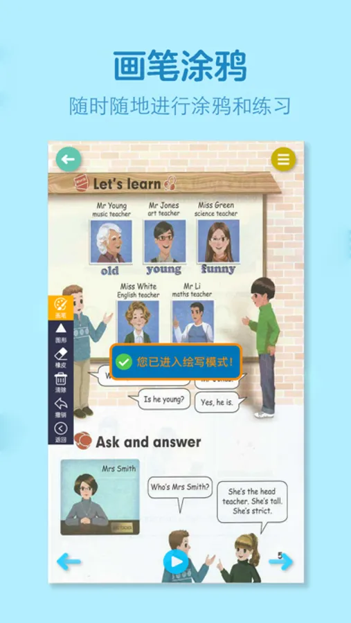【2】画笔功能,全屏涂鸦让学习更加的有趣让学习更加高效率。完全同步最新发行教材,绝无缺漏页现象。