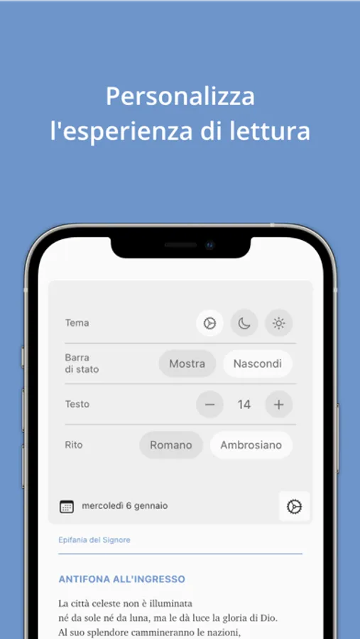 Personalizza l'esperienza di lettura scegliendo tra tema chiaro e scuro e modificando la dimensione del testo con impostazioni semplici e intuitive, oppure ripercorri le letture dei giorni passati selezionandoli dal calendario.