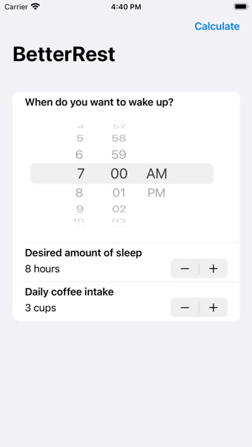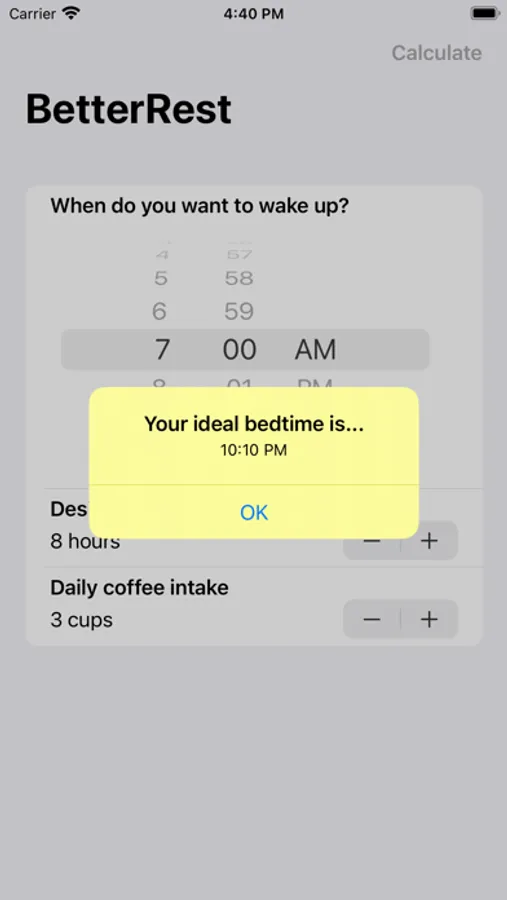 Better Rest uses Machine Learning to give you an estimation on optimal sleeping time based on the number of cups of coffee you had throughout the day, the time you want to wake up and the number of hours of sleep that you need.