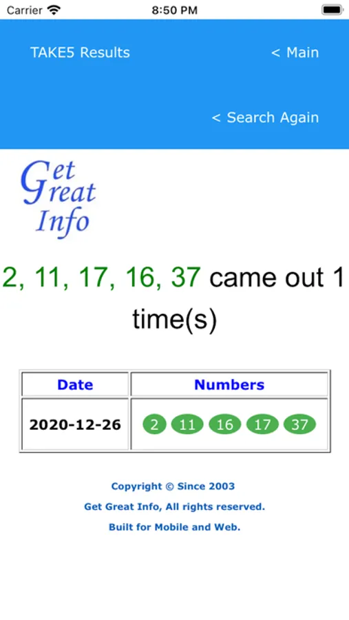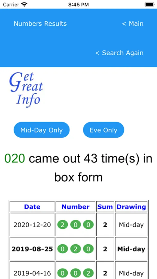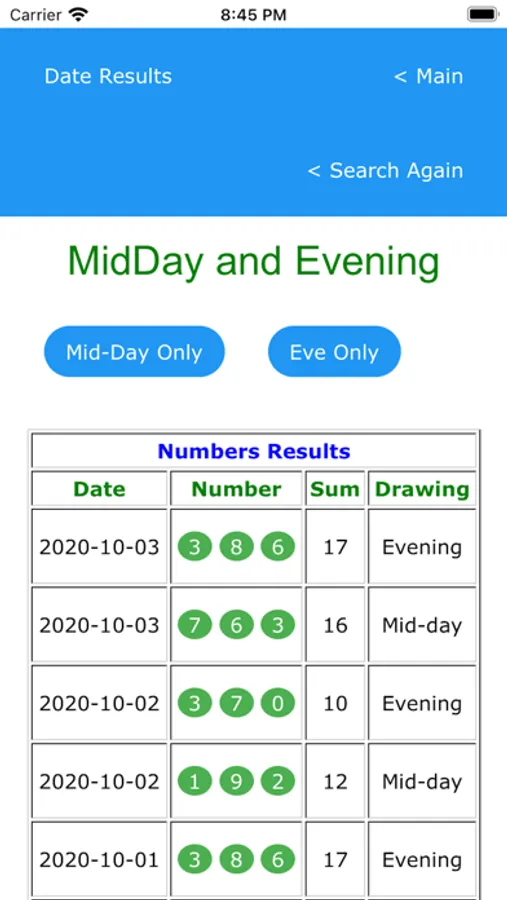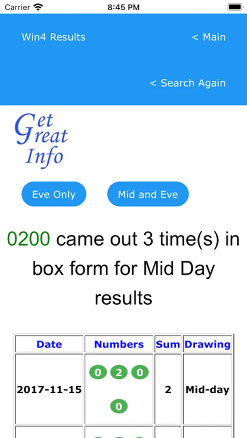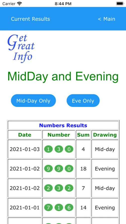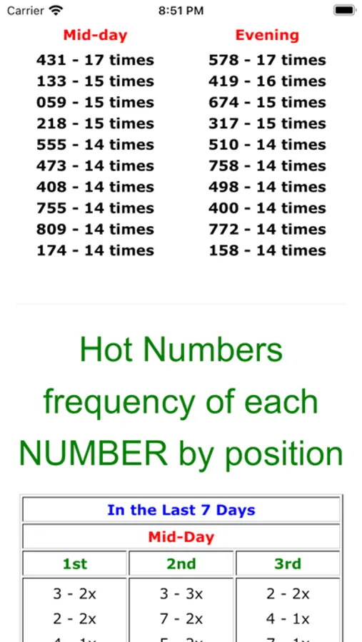 The true feature of this app is the ability for the users to search past results and analyze what numbers to choose to play. We do not claim to produce winning numbers with this app. We only provide a database of past results for anyone who uses this app to determine what numbers they may play based on past results.