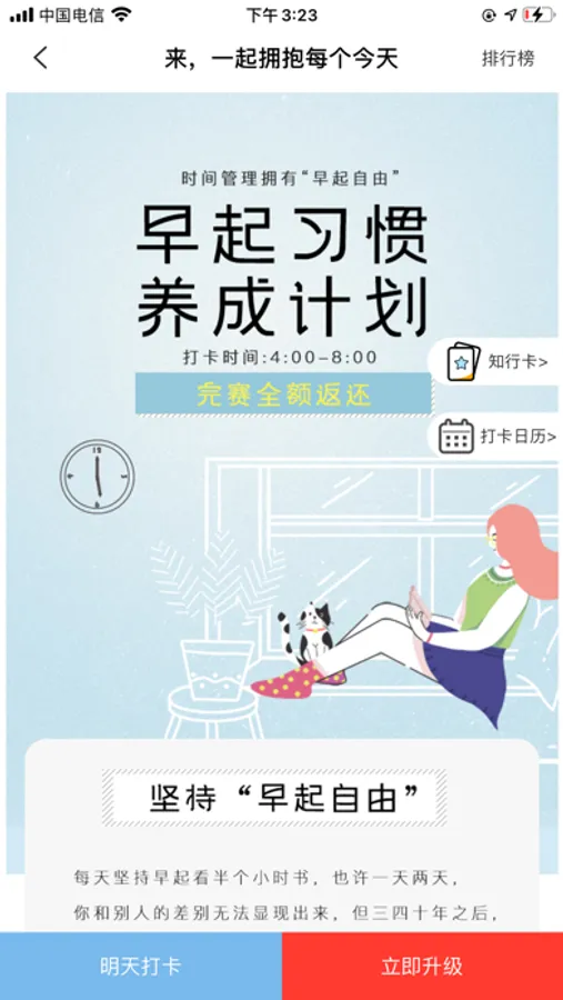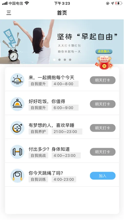 律行动习惯养成软件是基于互联网大数据时代下应运而生的一款习惯养成软件,供用户免费下载注册,律行动通过每日在规定时间内,用户上限打卡模式,帮助用户养成早起,早睡,按时吃早饭等习惯。用户可以通过打卡,获得自律币以及现金红包,自律币可用于兑换运动装备等礼品,极大提高了用户对于软件的粘性,在这个节奏快的,人们生活及其不规律的时代,律行动能够给用户带来一种健康的生活方式。