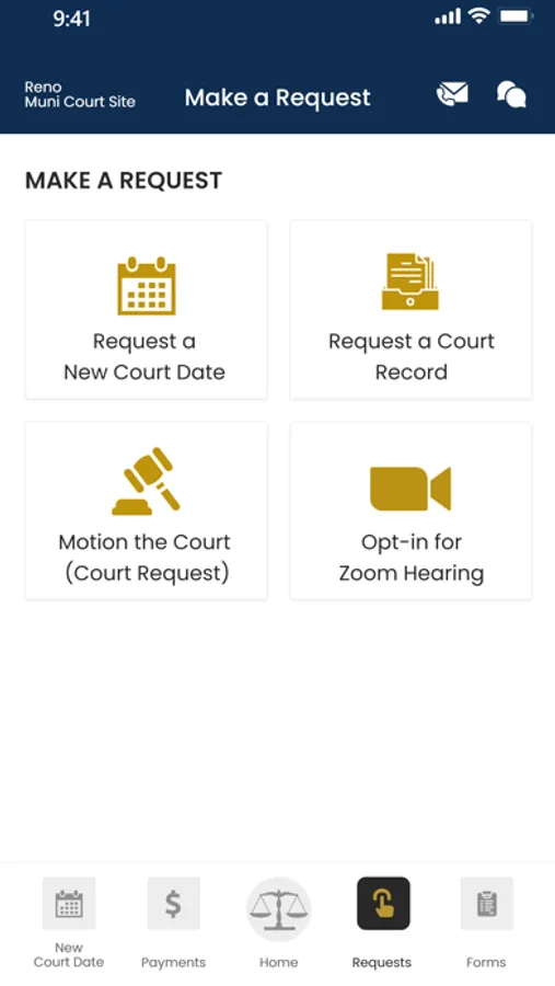 Access the Reno Municipal Court via the app. You can contact us via email, chat, or by phone. Make a payment, request a new court date, find information about your case, find your Zoom hearing information, request copies of past records, access court forms from your mobile device. In addition, you can link right to the website through the court app.