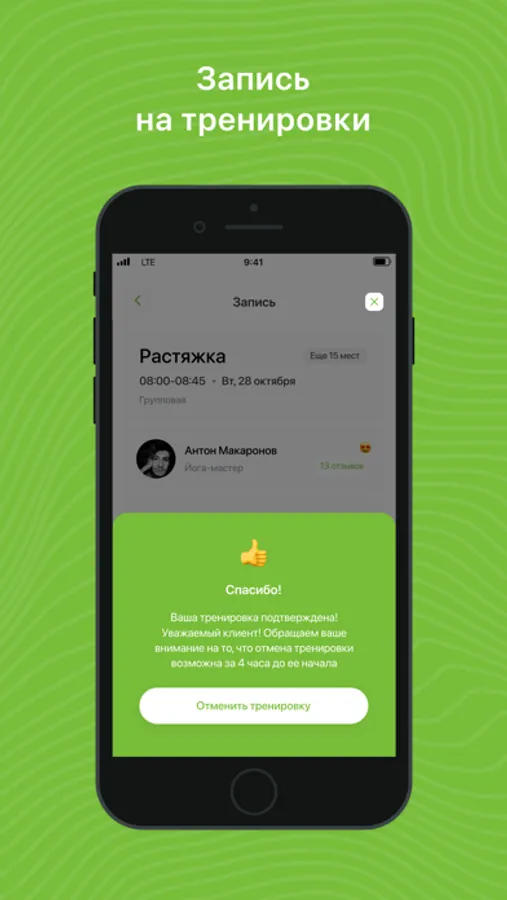 - Получать PUSH-уведомления о предстоящей тренировке за 3 часа.