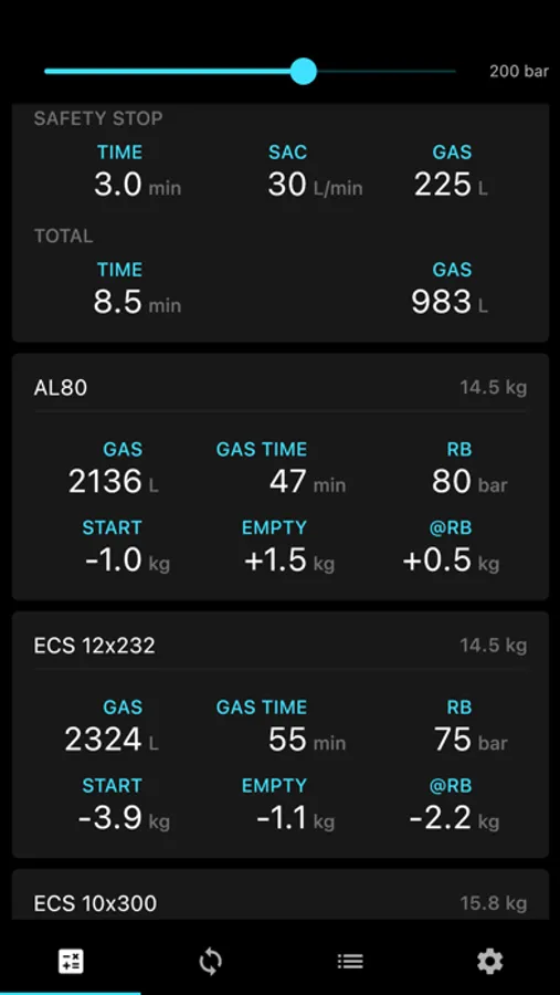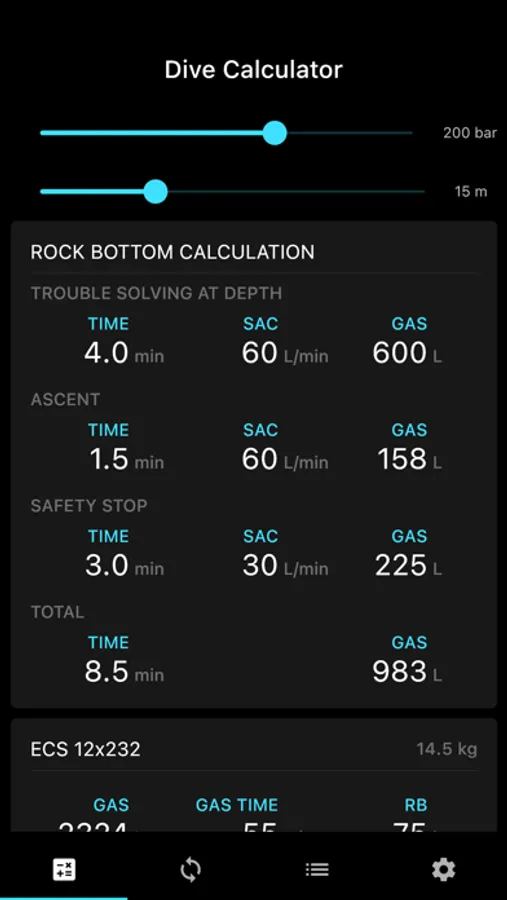 A scuba tank calculator utility app -- calculates rock bottom air requirements, gas time, and transfills for various tank sizes.