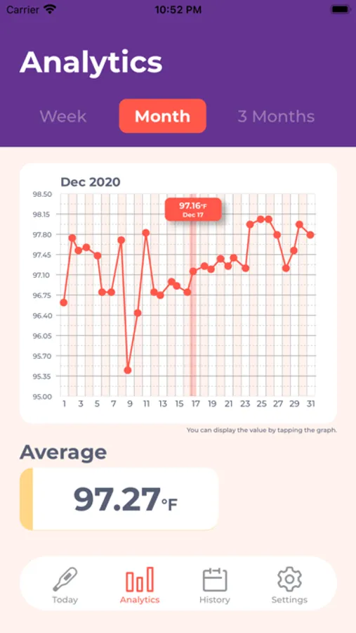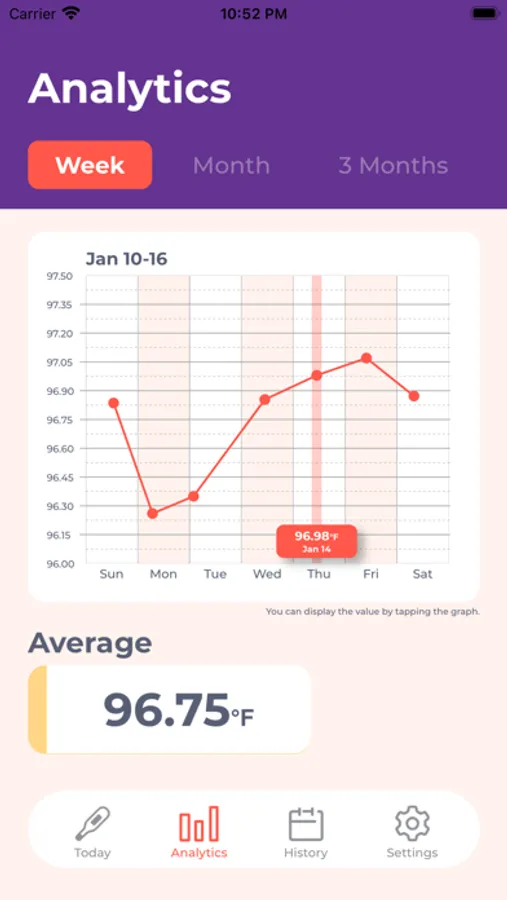 On the "Analysis" screen, a graph of weekly, monthly, and 3-month body temperature is displayed. In addition, the average body temperature for that period is displayed. You can check the data by tapping the graph.