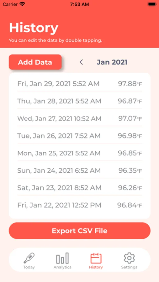 On the "History" screen, the record of the body temperature of the year and month selected in the upper right of the screen is displayed. You can correct the body temperature data by double tapping the data. If you forget to record the body temperature data, you can add it by tapping the "Add" button on the upper left of the screen. When you tap the "Add" button, the input screen will be displayed. Select and add the date, time, and body temperature. By tapping the "Export CSV file" button, you can convert the history data to a CSV file and attach it to an email for export.