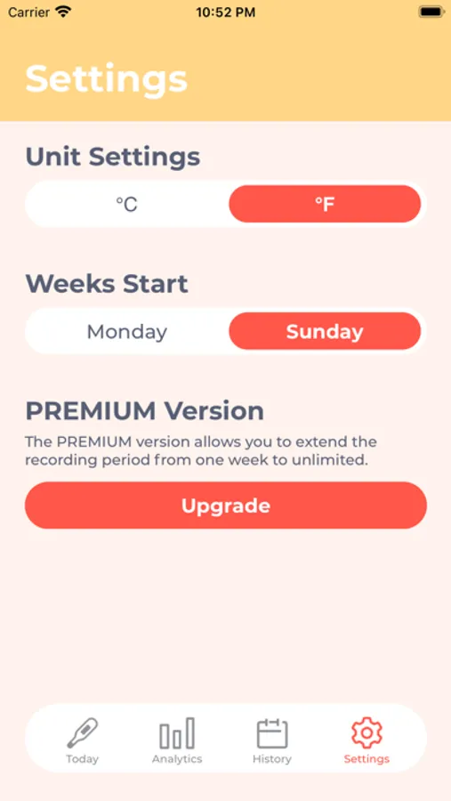 On the "Settings" screen, you can set the unit of body temperature. You can also set the day of the week at the beginning of the week in the weekly graph. You can choose to start on Monday or Sunday.