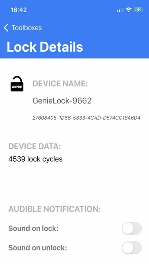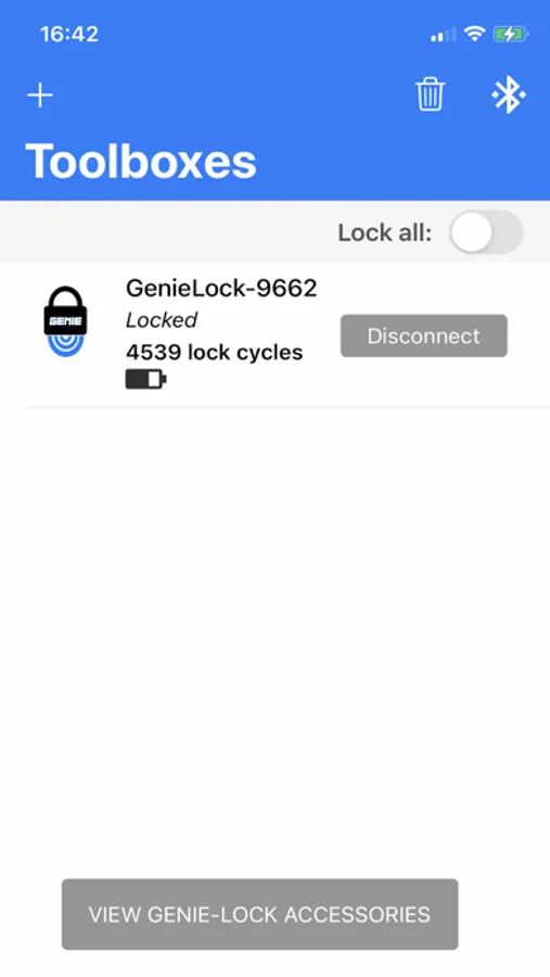 when in Bluetooth range and connected you can also lock and unlock your toolbox via a button in the app, turn on and off the audible buzzer.The app also displays the number of lock and unlock operations it has completed and gives you the opportunity to win free Genie-Lock Merchandise.