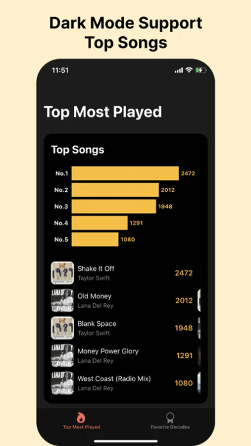 Rank and visualize your top played songs, artists, and genres in colors. The record includes all songs included in your music library.