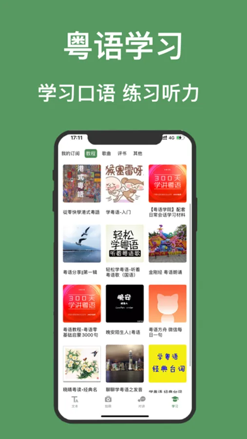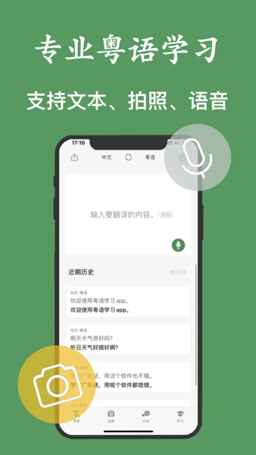 粤语翻译是为了学习粤语,广东话,白话而设计的一款翻译工具。其支持文本翻译,语音翻译,对讲翻译,拍照翻译,粤语学习频道: