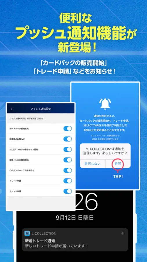 プッシュ通知の設定をオンにすると、「カードパックの販売開始」「トレード申請」などをプッシュ通知でお知らせします。